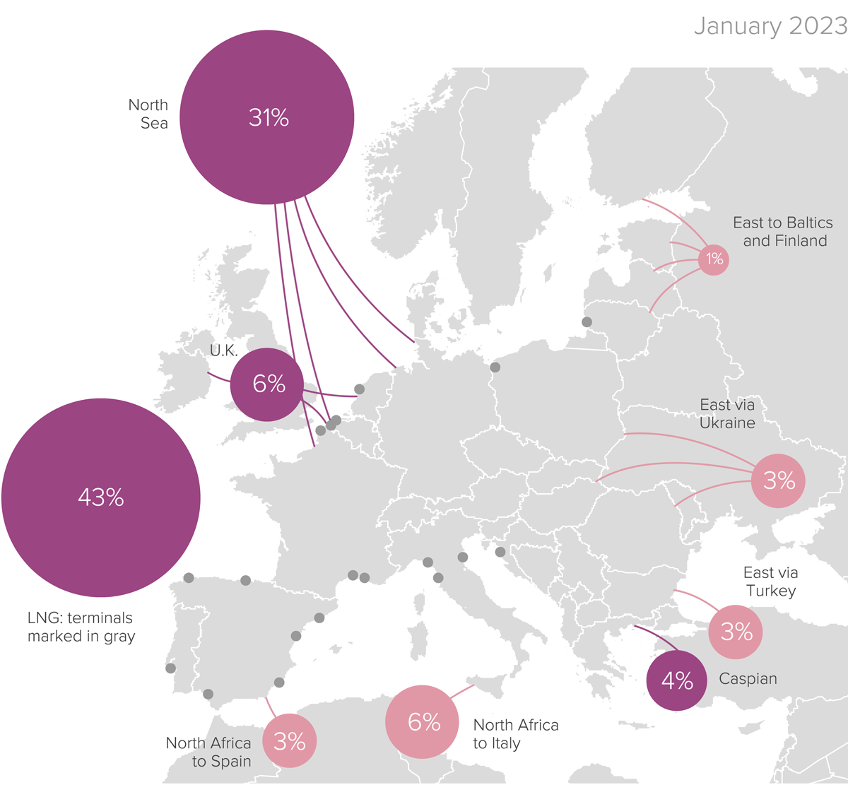 The conflict has changed the bloc's energy mix, boosting the presence of liquefied natural gas. The map below shows imports of gas to the EU before the war and at the start of the year. Routes where inflows have increased are colored in dark purple.